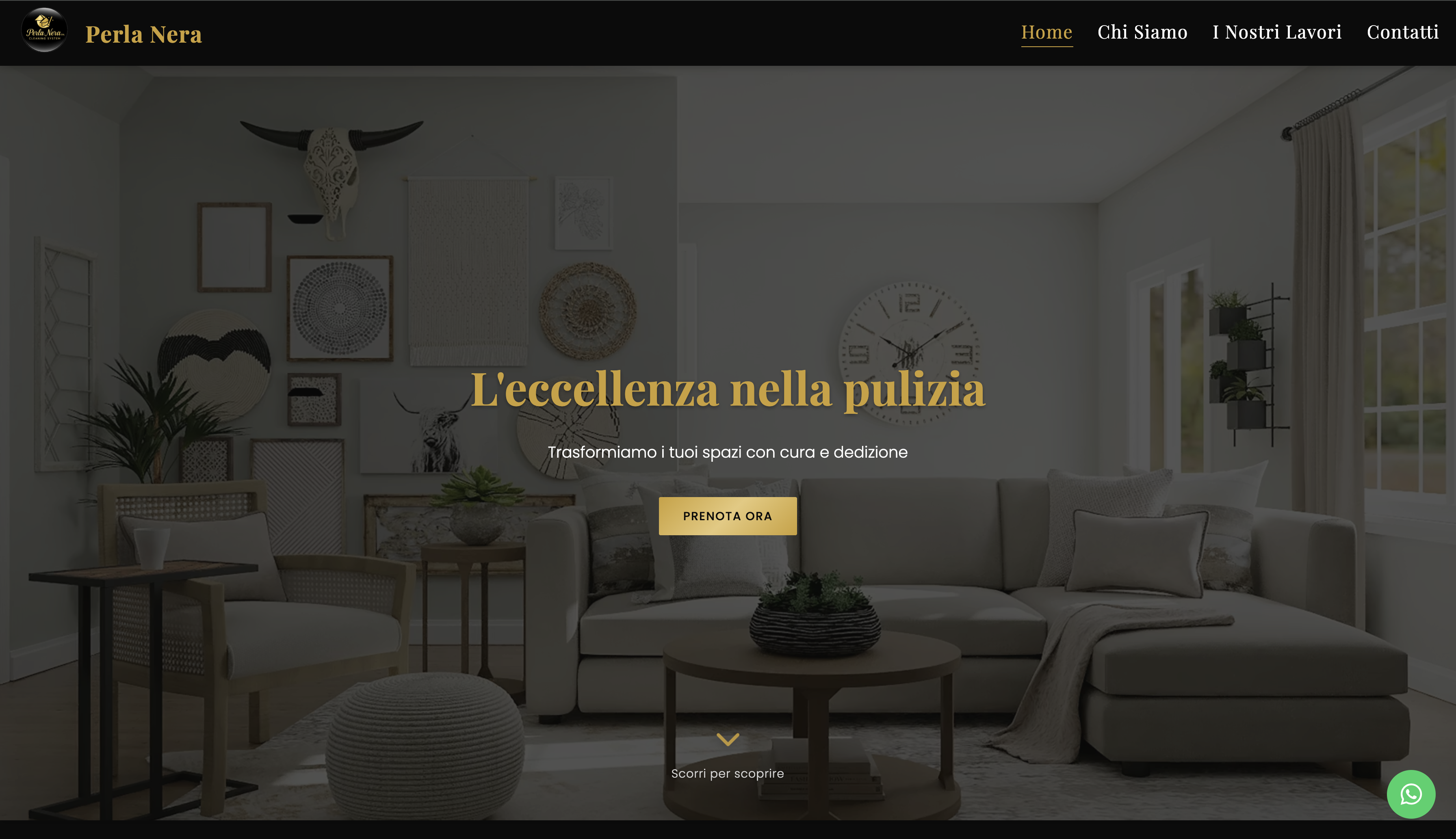 Perla Nera offriva un servizio di pulizia di alta gamma, ma il suo sito web non rifletteva la qualità e l'attenzione ai dettagli che mettevano nel loro lavoro. Abbiamo creato un sito elegante e raffinato che ha colmato quel divario, trasformando la loro presenza online e consentendo loro di attrarre una nuova clientela di prestigio, fatta di hotel, concessionarie di lusso e studi professionali.